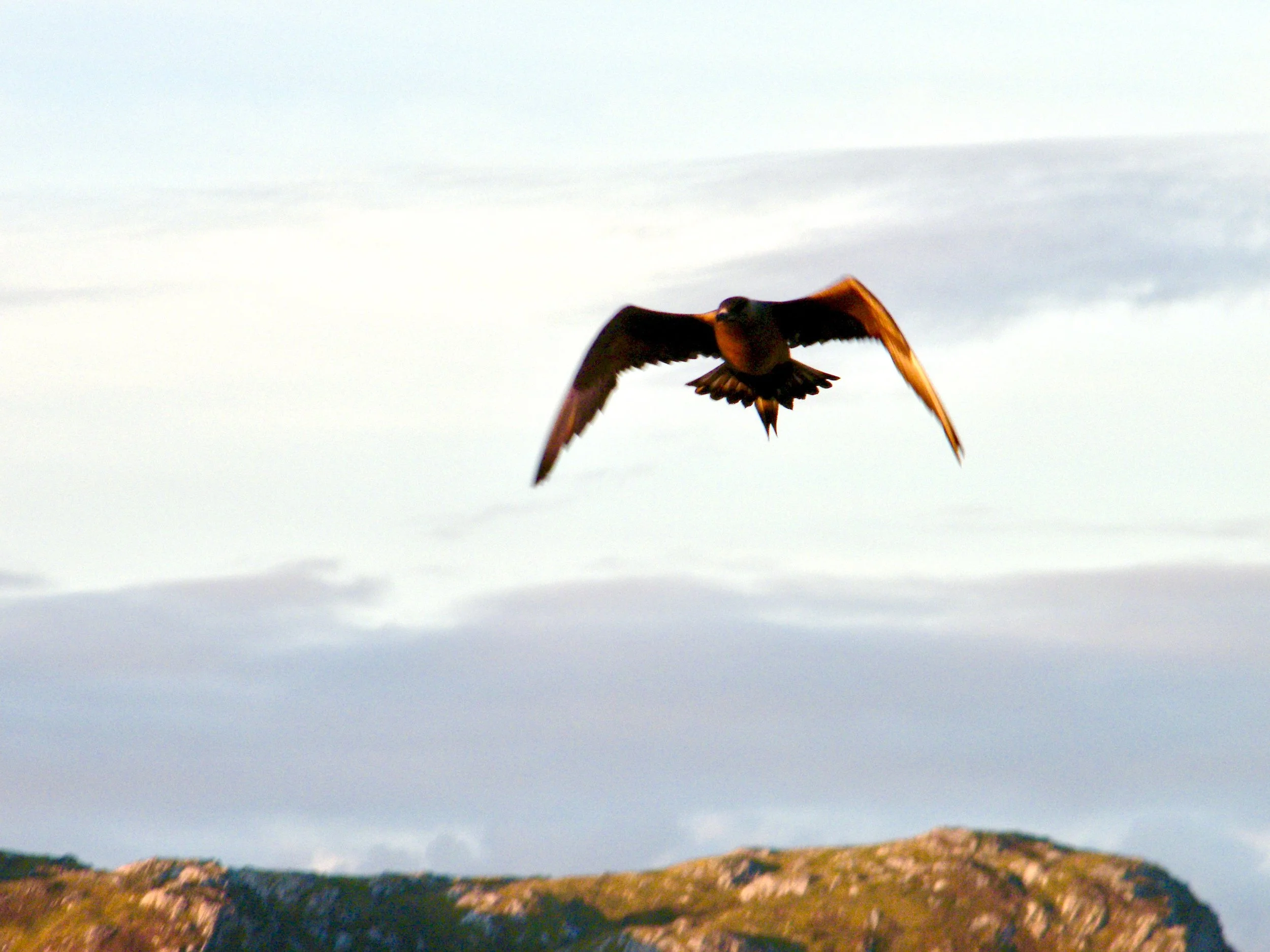 Artic skuas feed mainly by kleptoparasitism, taking food from other seabirds. They will also hunt for their own, fish, rodents, small birds, mammals and eggs. They are sturdy birds, typically about 18 inches body length with a four foot wingspan.