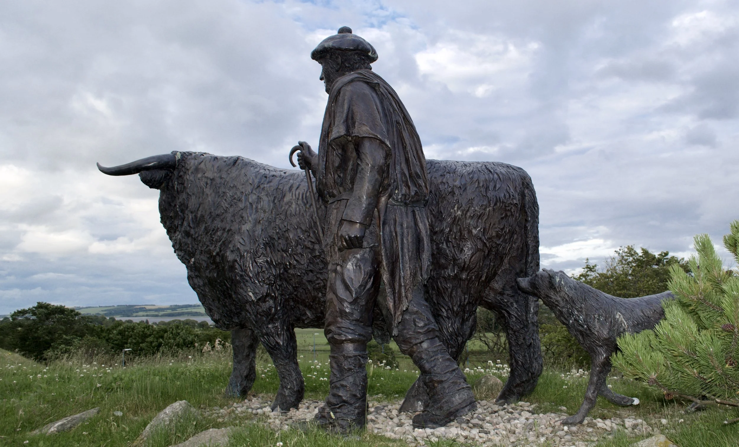 Drover with his dog and black bull -statue at entrance of Dingwall livestock market.